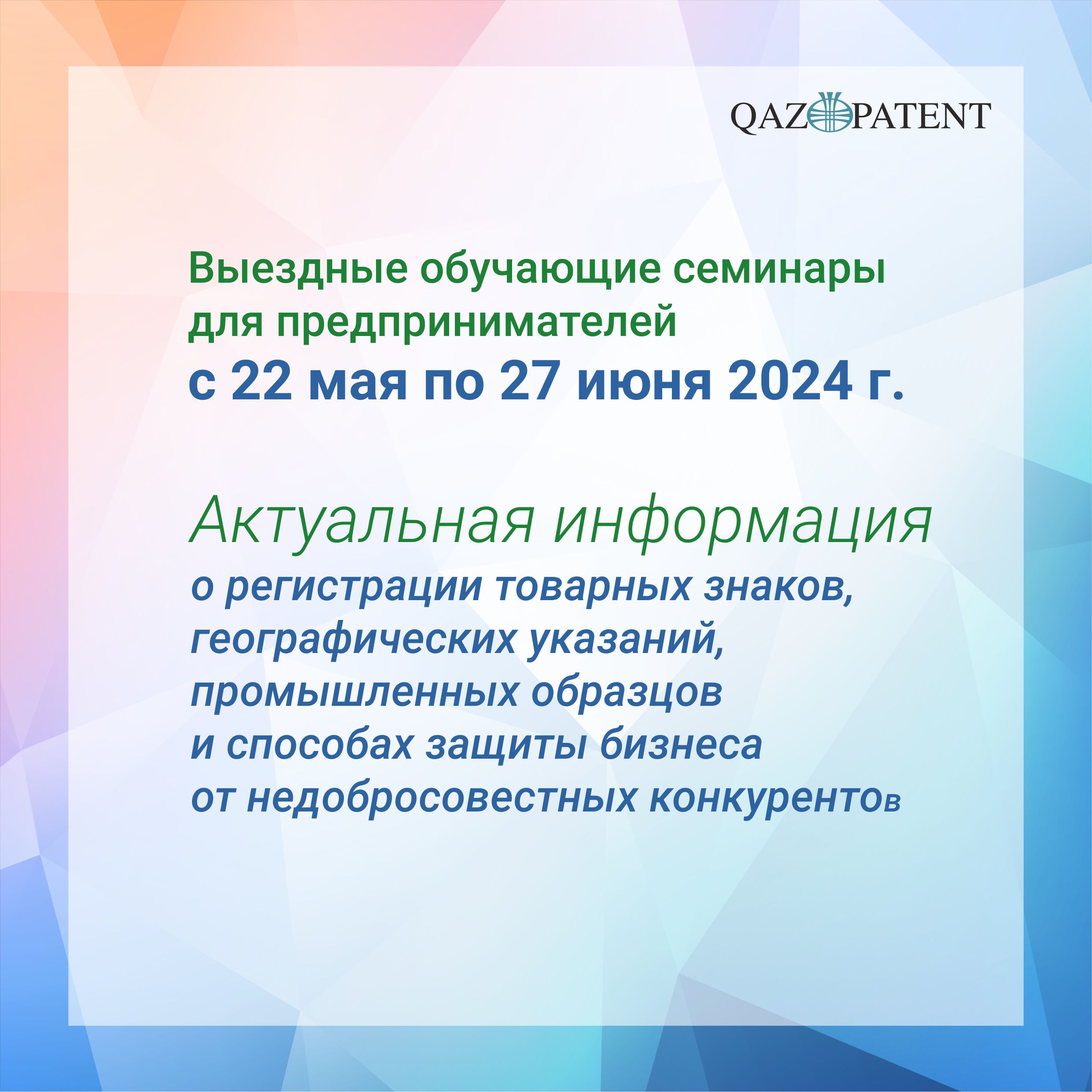 2024 жылдың 22 мамыры мен 27 маусым аралығында Qazpatent ұйымының тауар белгілері, географиялық нұсқамалар, тауарлар шығарылған жерлердің атаулары және өнеркәсіптік үлгілер департаментінің жетекші сарапшылары көшпелі оқыту іс-шараларын өткізеді. Аталған іс-шара барысында қатысушыларға тауар белгілерін, географиялық нұсқамаларды, өнеркәсіптік үлгілерді тіркеу және бизнесті жосықсыз бәсекелестерден қорғау тәсілдері туралы өзекті ақпарат беріледі, сондай-ақ өтініш беру және Qazpatent жеке кабинетінде жұмыс істеу бойынша практикалық көмек көрсетіледі.