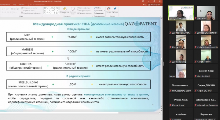 Qazpatent Қазақстан Республикасы Қаржылық мониторинг агенттігінің және Әділет департаменттерінің қызметкерлері үшін «Домендік және фирмалық атаулардың тауар белгілерімен соқтығысуы» тақырыбында оқыту вебинарды өткізді.