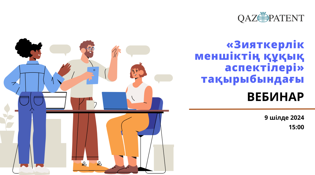 9 шілдеде сағат 15:00-де Qazpatent «Агротехнологияларды трансферттеу және коммерцияландыру орталығы» ЖШС-ның қызметкерлеріне «Зияткерлік меншіктің құқық аспектілері» тақырыбында вебинар өткізеді.
