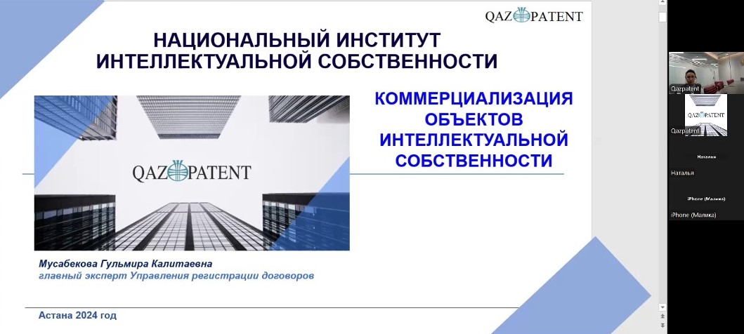 Вебинар шеңберінде зияткерлік меншік объектілерін коммерцияландыру мәселелері ашылды.