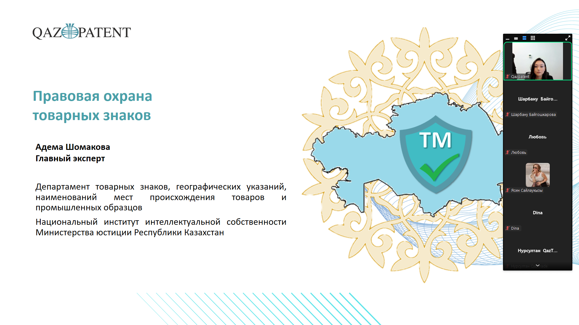 20 тамыз күні Qazpatent «KazakhExport» АҚ, «QazTrade» АҚ, «QazIndustry» АҚ және «Қазақстанның Даму банкі» АҚ-мен бірлесіп Абай облысының кәсіпкерлеріне «Кәсіпкерлерді мемлекеттік қолдау шаралары» тақырыбында онлайн-семинар өткізді.
