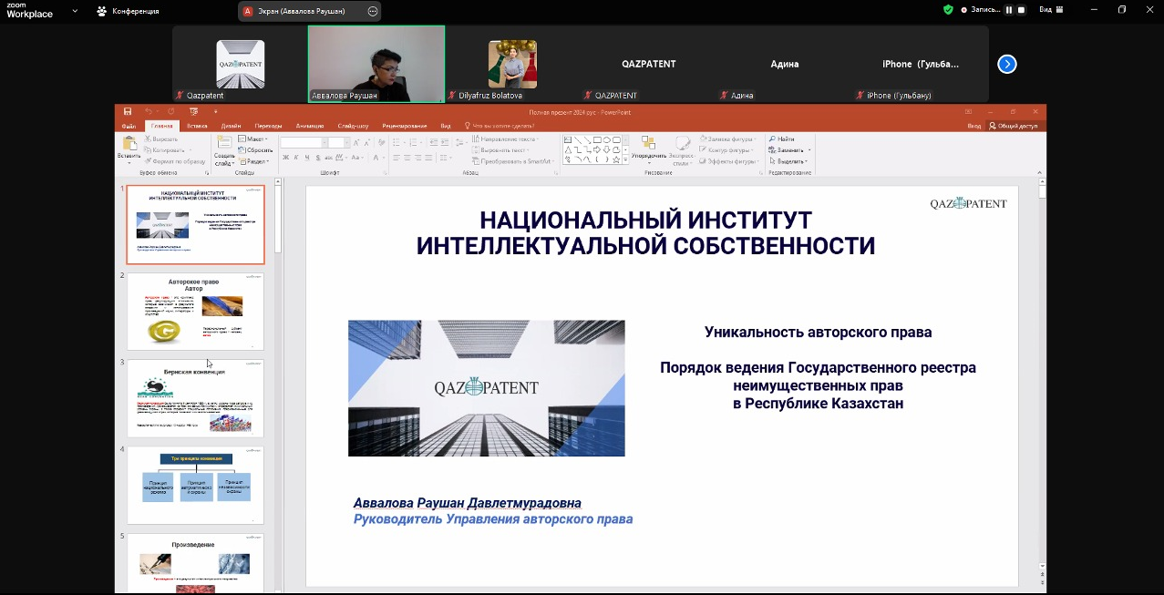 Вебинар шеңберінде Қазақстан Республикасында авторлық құқықты тіркеу, өнертабыстар мен пайдалы модельдерді патенттеу, Қазақстан Республикасында тауар таңбасын тіркеу, сондай-ақ зияткерлік меншік объектілерін коммерцияландыру мәселелері ашылды.