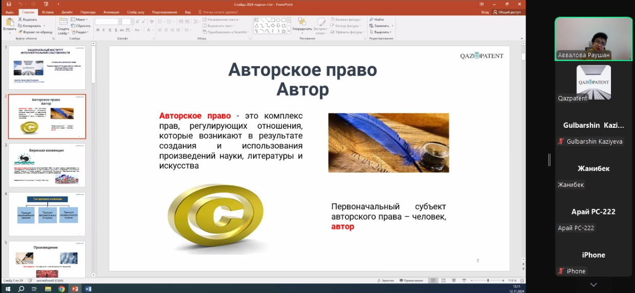 12 қарашада Qazpatent Қазақ Спорт және Туризм Академиясының студенттеріне және профессор-оқытушылар құрамына «Зияткерлік меншік объектілерін құқықтық қорғау» тақырыбында вебинар өткізді.