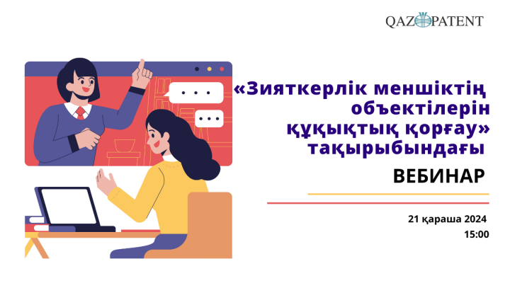 21 қарашада сағат 15:00-де Qazpatent Astana IT University студенттері мен қызметкерлері үшін «Зияткерлік меншік объектілерін құқықтық қорғау» тақырыбында вебинар өткізеді.