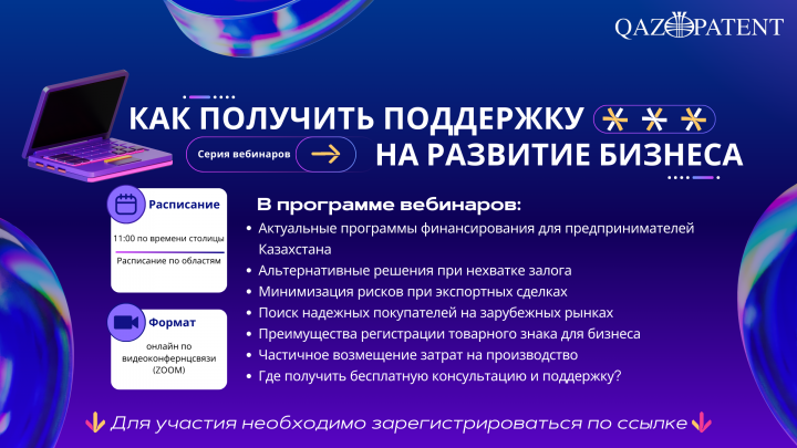 Ұлттық зияткерлік меншік институты (Qazpatent) «Қазақстанның экспорттық-кредиттік агенттігі» АҚ, «QazTrade» АҚ және «QazIndustry» АҚ қолдауымен кәсіпкерлерді тегін вебинарға шақырады. Бағдарлама мемлекеттік қолдау шаралары аясында жүзеге асып отыр.