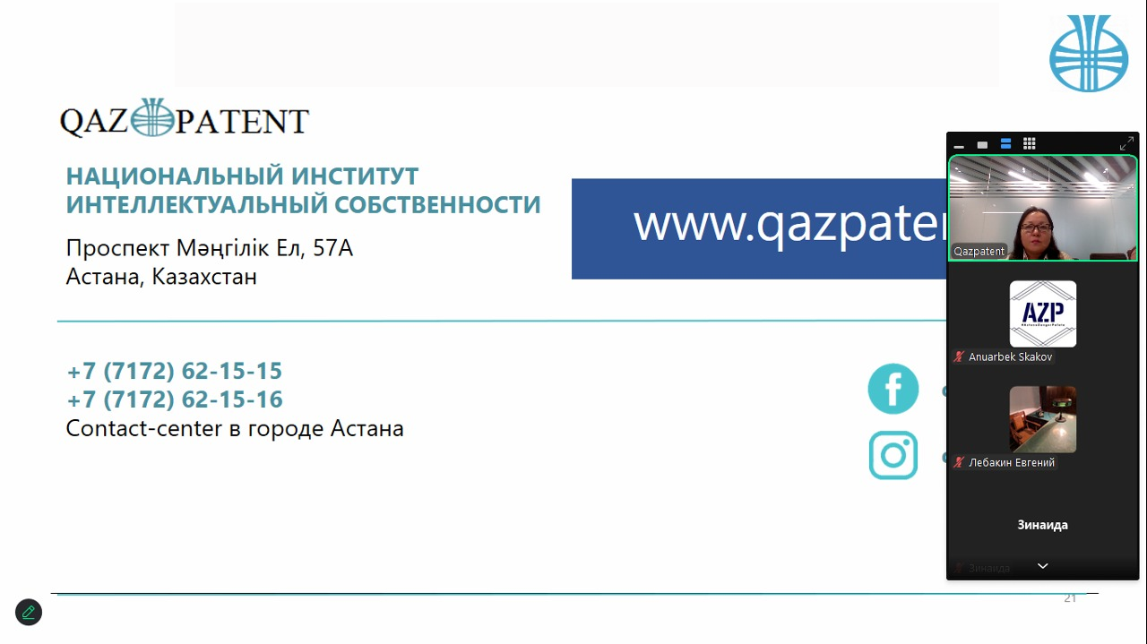 Вебинар шеңберінде Қазақстан Республикасында тауар белгісін құқықтық қорғау, Мадрид жүйесі бойынша тауар белгісін халықаралық тіркеу, өнертабыстар мен пайдалы модельдерді патенттеу, Патенттік кооперация туралы шартқа (PCT) сәйкес өнертабыстарды халықаралық патенттеу, Еуразиялық патенттік Конвенцияға сәйкес өнертабыстарды өңірлік патенттеу, Қазақстан Республикасында және Еуразиялық жүйеде өнеркәсіптік үлгілерді құқықтық қорғаудың ерекшеліктері мәселелері, сондай-ақ Қазақстан Республикасында географиялық нұсқамалар және тауарлар шығарылған жерлердің атауларын құқықтық қорғау мәселелері талқыланды.