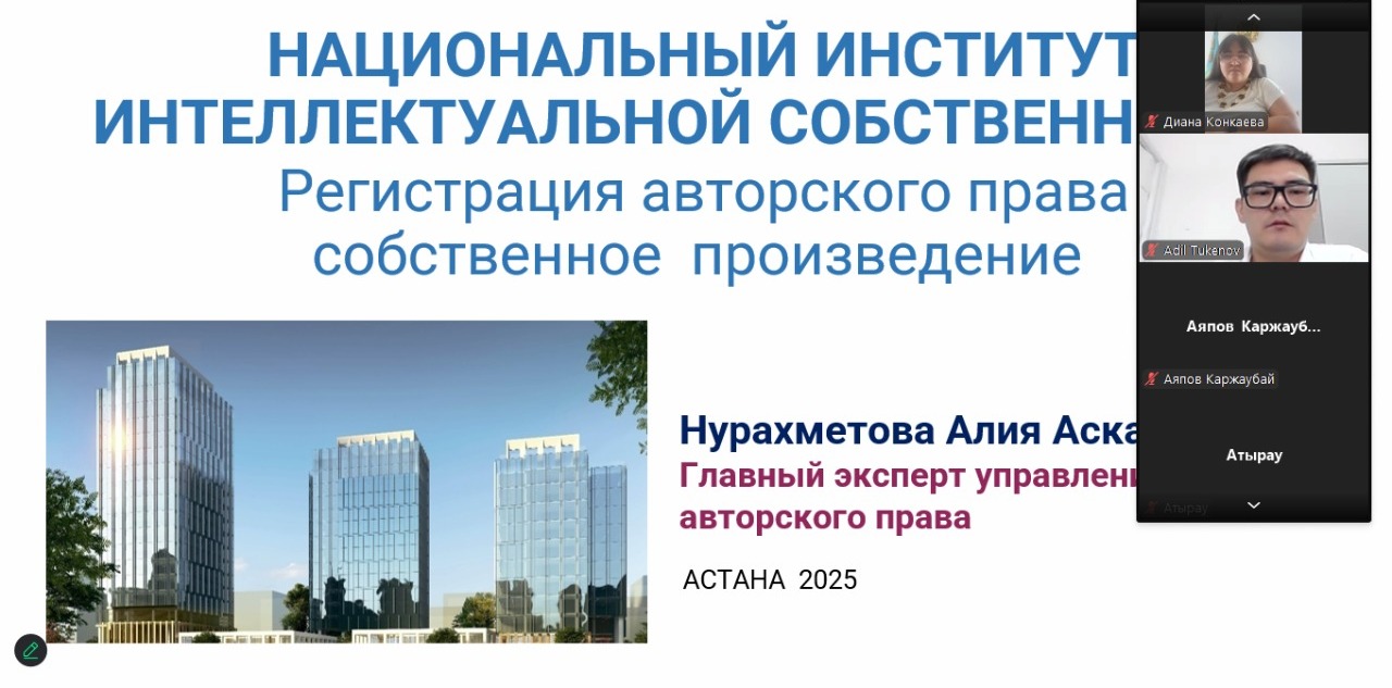 Вебинар шеңберінде өз туындысына авторлық құқықты тіркеу және тауар белгілерін, географиялық нұсқамалар және тауарлар шығарылған жерлердің атаулары құқықтық қорғау мәселелері ашылды.