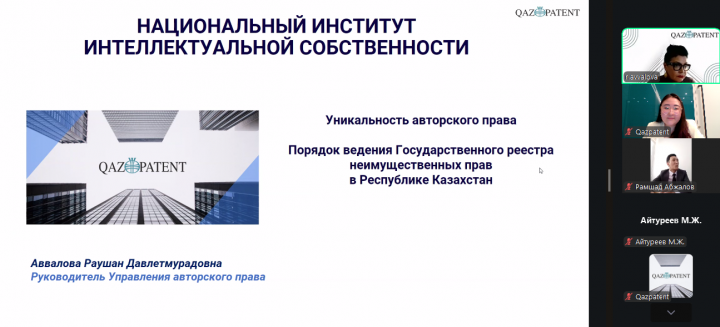 Вебинар барысында авторлық құқық пен өнеркәсіптік үлгілердің құқықтық қорғалуы мәселелері талқыланды.