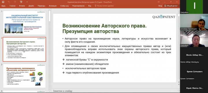 Вебинар аясында Қазақстан Республикасындағы Авторлық құқық, құқықтарды берудің негізгі нысандары және зияткерлік меншік құқықтарын қорғау құралдары тақырыптары ашылды.
