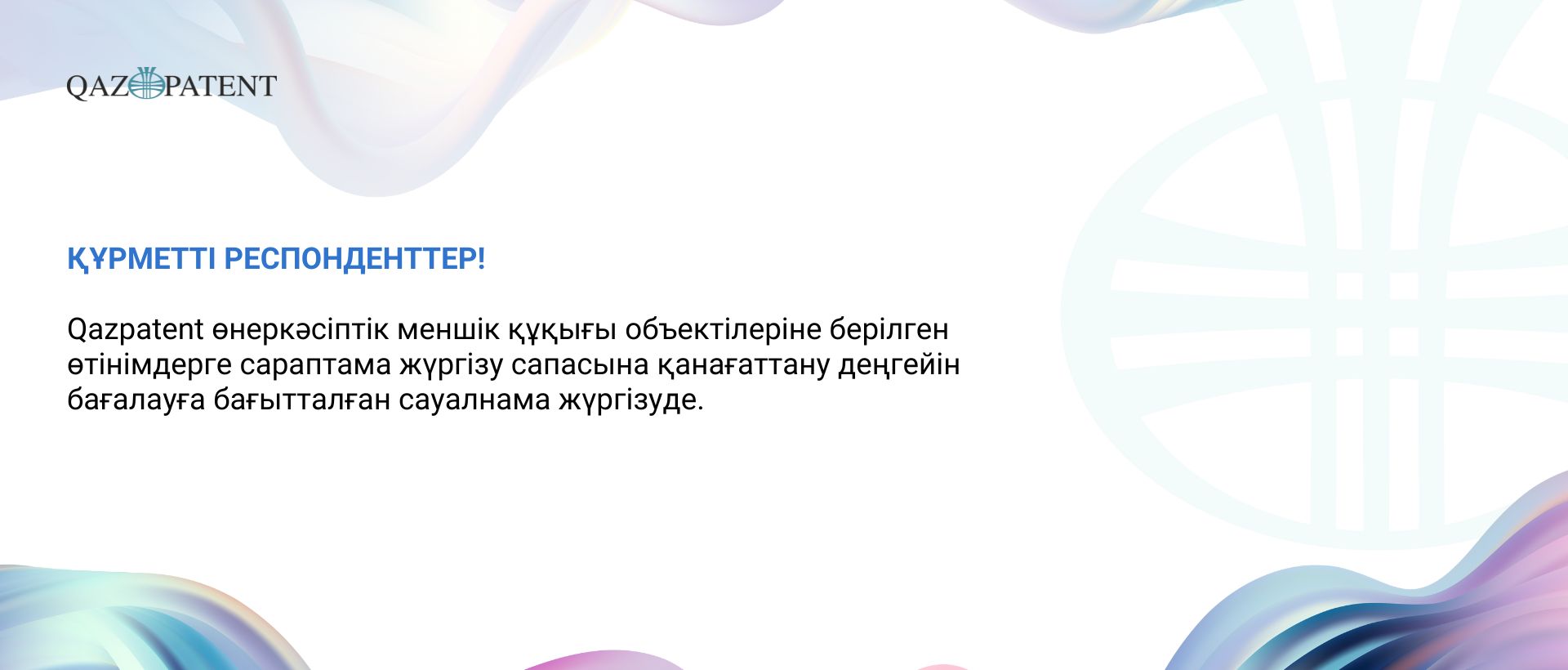 Qazpatent өнеркәсіптік меншік құқығы объектілеріне берілген өтінімдерге сараптама жүргізу сапасына қанағаттану деңгейін бағалауға бағытталған сауалнама жүргізуде.