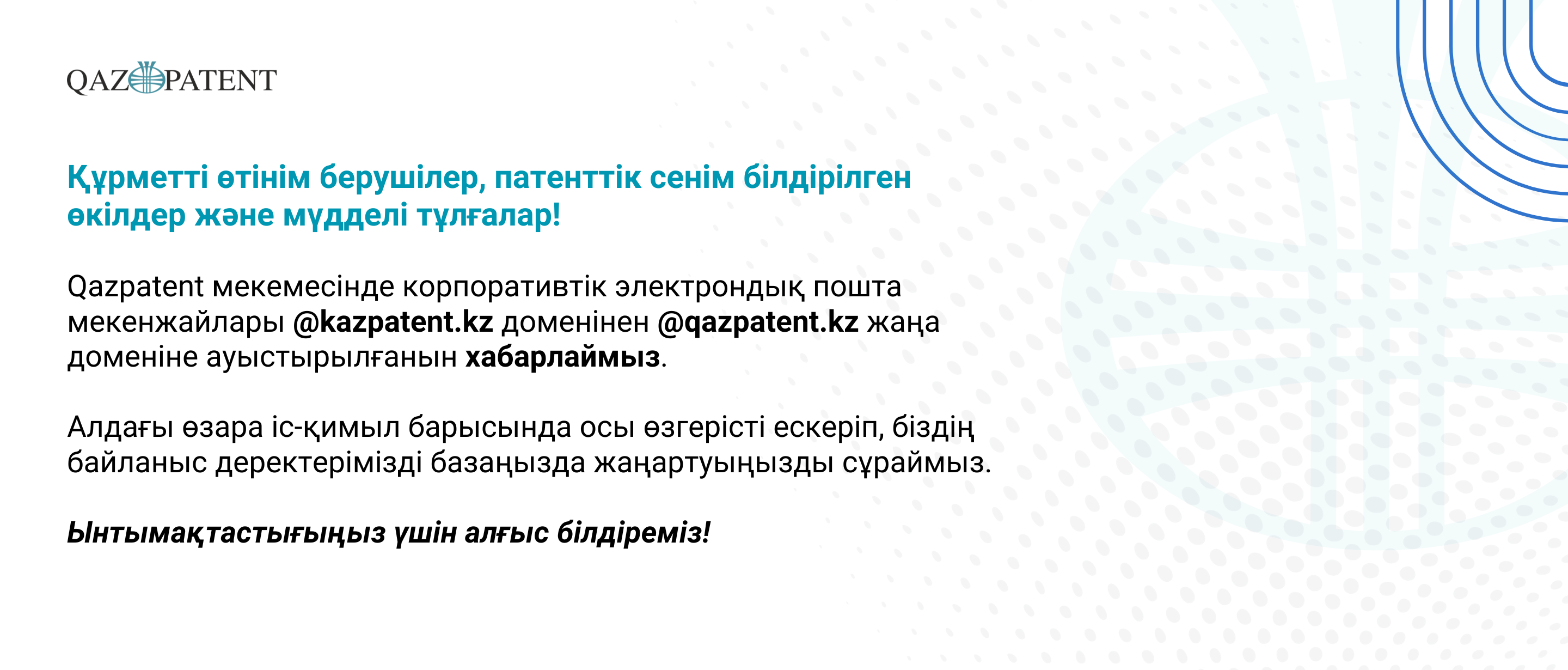 Qazpatent мекемесінде корпоративтік электрондық пошта мекенжайлары @kazpatent.kz доменінен @qazpatent.kz жаңа доменіне ауыстырылғанын хабарлаймыз.