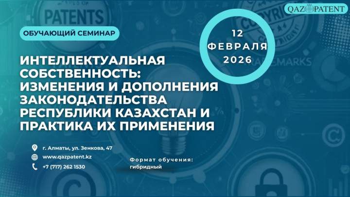 Qazpatent филиалы Сізді Қазақстан Республикасының заңнамасына енгізілген өзгерістер мен толықтыруларды ескере отырып, зияткерлік меншік объектілерін құқықтық қорғау, пайдалану және қорғау мәселелеріне арналған бір күндік оқыту семинарына қатысуға шақырады.