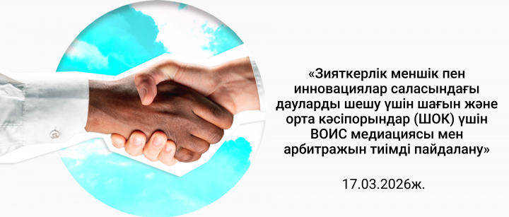 Еуразиялық патенттік ведомство (ЕАПВ) мен Дүниежүзілік зиякерлік меншік ұйымы бірлесіп «Зияткерлік меншік пен инновациялар саласындағы дауларды шешу үшін шағын және орта кәсіпорындар (ШОК) үшін ДЗМҰ медиациясы мен арбитражын тиімді пайдалану» тақырыбында өңірлік вебинар өткізеді.