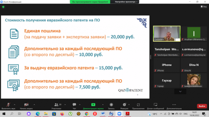 18 августа Qazpatent провел обучающий вебинар для предпринимателей Центра предпринимательства Qolday на тему: «Интеллектуальная собственность в предпринимательской деятельности».