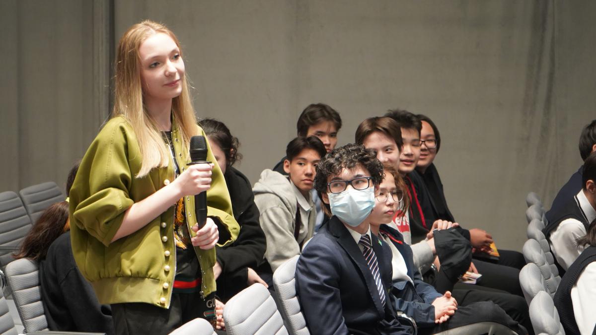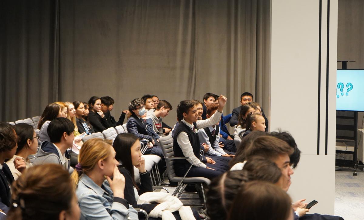 Мероприятие с участием школьников 8-11 классов началось с показа специального выпуска Агентства Хабар о конкурсе школьников: «Продолжение большого пути».