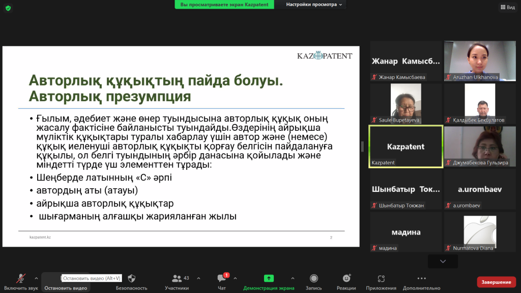 4-5 мая Kazpatent провел обучающий вебинар для профессорско-преподавательского состава и студентов Таразского регионального университета имени М. Х. Дулати на тему: «Охрана и защита объектов интеллектуальной собственности».