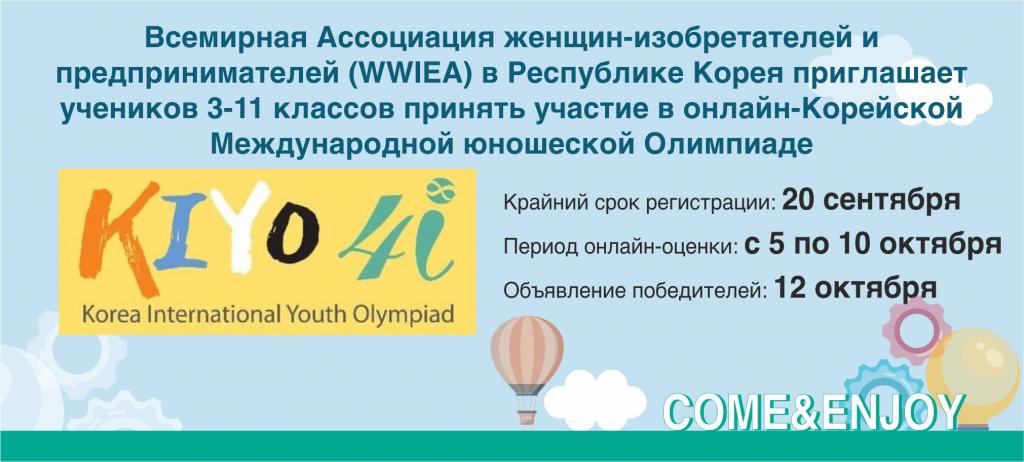 Всемирная Ассоциация женщин-изобретателей и предпринимателей (WWIEA) в Республике Корея приглашает учеников 3-11 классов принять участие в онлайн-Корейской Международной юношеской Олимпиаде #KIYO4i2020 по 2 направлениям: