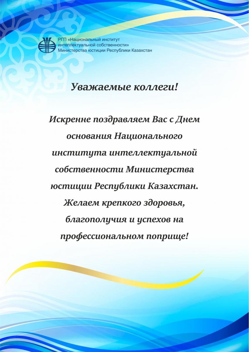 Уважаемые коллеги! Искренне поздравляем Вас с Днем основания Национального института интеллектуальной собственности. Желаем крепкого здоровья, благополучия и успехов на профессиональном поприще!