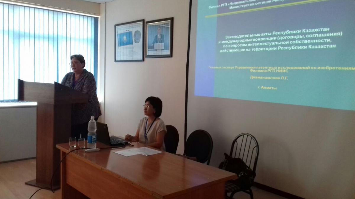 Главный эксперт управления патентных исследований по изобретениям ДжаманшаловаЛ.Г. выступила с лекциями на темы: «Законодательные акты Республики Казахстан и Международные конвенции (договоры, соглашения) по вопросам интеллектуальной собственности, действующие на территории Республики Казахстан» и «Изобретение и полезная модель как объекты промышленной собственности в соответствии с изменениями в Патентном законе РК»; начальник Учебного центра АбдильдановаА.А. проинформировала слушателей семинара о Республиканском конкурсе достижений в области изобретательства «Шапагат» с темой сообщения: «Стимулирование изобретательства и инноваций в Республике Казахстан».