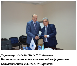 В целях подписания Программы сотрудничества, а также установки программного обеспечения макросов для редакторской службы РГП «НИИС» и обсуждения альтернативного варианта электронной подачи через национальное патентное ведомство,7 декабря 2015 года состоялась встреча с делегацией ЕАПВ в составе Начальника управления патентной информации и автоматизации Сиротюка В.О. и Начальника группы развития безбумажных информационных технологий ЕАПВ Тюрина Е.Г. ибыла подписана Программа сотрудничества в области автоматизации и информатизации между ЕАПВ и РГП «НИИС».