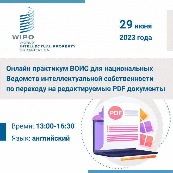 29 июня 2023 года состоится онлайн практикум для национальных Ведомств интеллектуальной собственности, организуемый Всемирной организацией интеллектуальной собственности в сотрудничестве с Государственным ведомством интеллектуальной собственности Китая на тему "Переход в редактируемые PDF документы". В онлайн практикуме примет участие спикер c Казпатента на тему "Инсайты от Ведомств-участников, использующих редактируемые PDF документы".