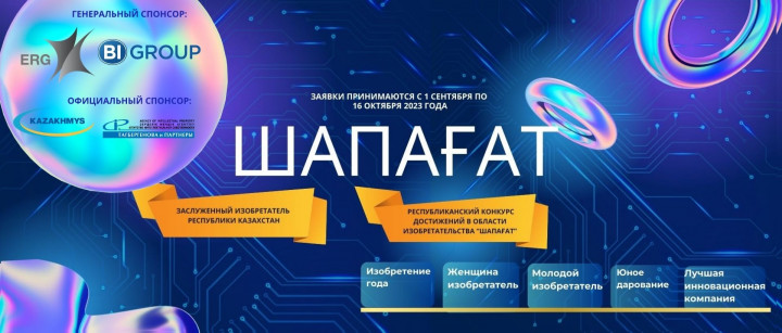 Заявки и ходатайства для участия в Конкурсе "Шапағат" и для присуждения почетного звания "Заслуженный изобретатель Республики Казахстан" принимаются с 1 сентября по 16 октября 2023 года по электронному адресу shapagat@kazpatent.kz.