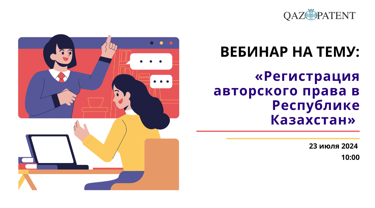 23 июля в 10:00 Qazpatent проведет совместный вебинар с Департаментом юстиции города Костанай для членов Национальной палаты предпринимателей «Атамекен» на тему «Регистрация авторского права в Республике Казахстан».